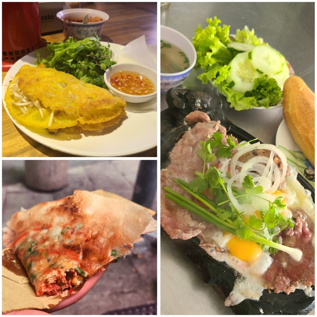 Bánh xèo: A savory pancake//crepe-like dish, commonly filled with things like beef or shrimp, and bean sprouts.