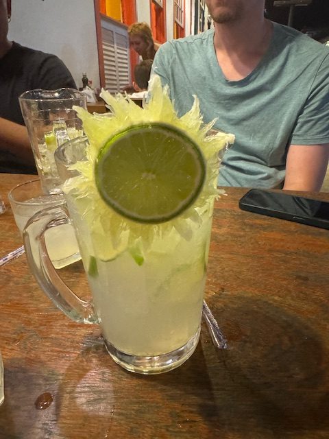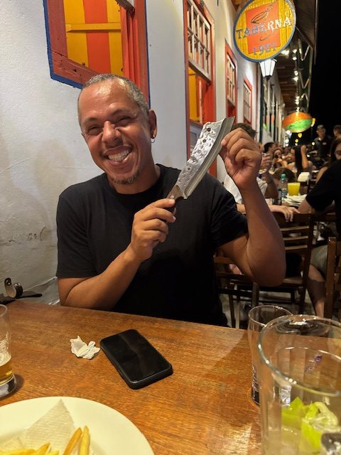 After settling in we all walked to a restaurant where we enjoyed a snack and some local drinks – Caipirinha (which are pieces of art on their own). Its here that many street vendors approached us. All items were hand made, giving the area even more of an artsy feel. During the time I bought my daughter a beautiful pair of abalone shell earrings, my son back home a hand crafted knife for his collection and gifted Geraldo with a beautifully crafted knife as well (he was so happy). Towards the end of our time in this location a local artist came to the table and began creating a hand painted tile picture for us that Geraldo gifted to us.