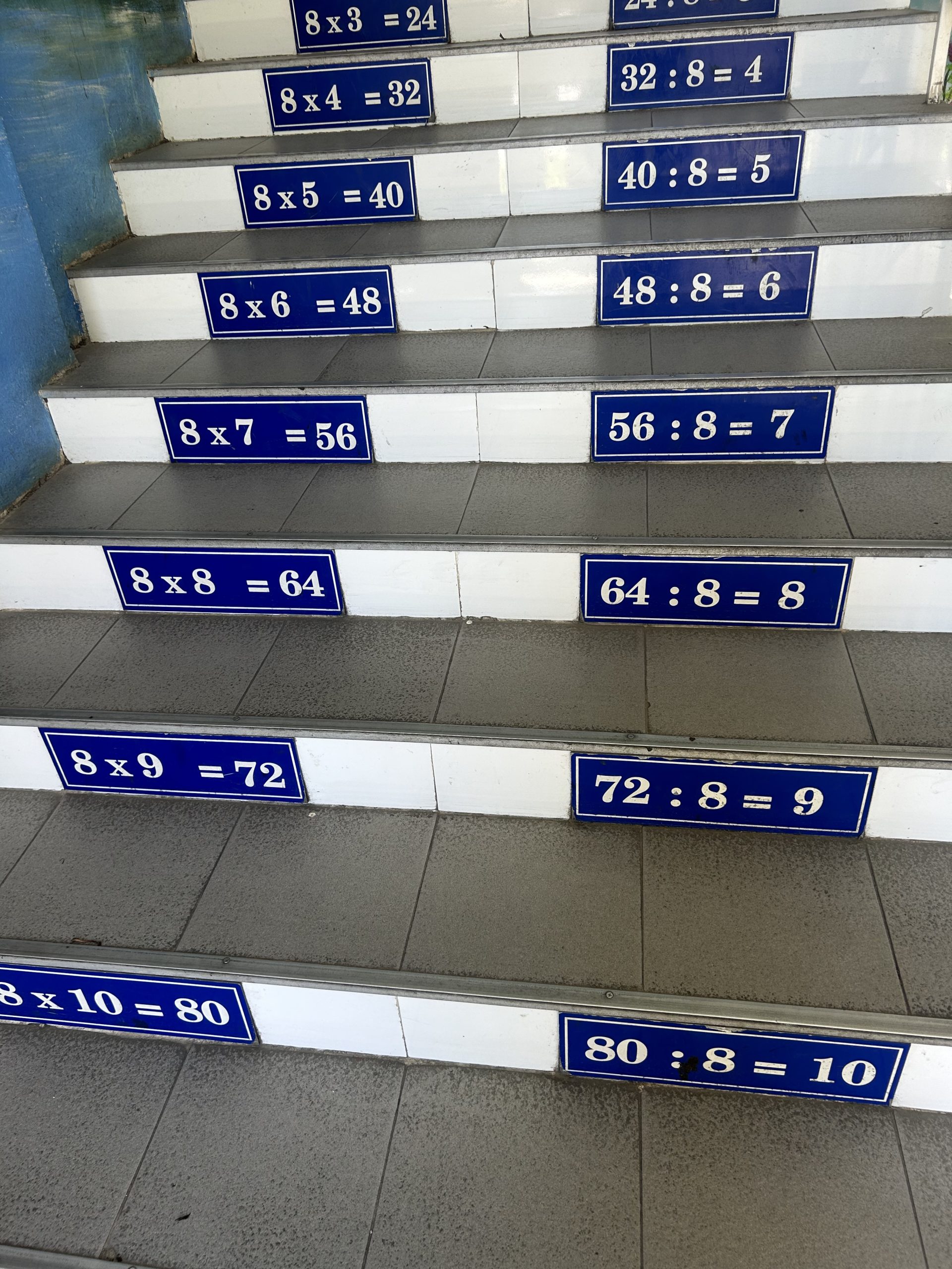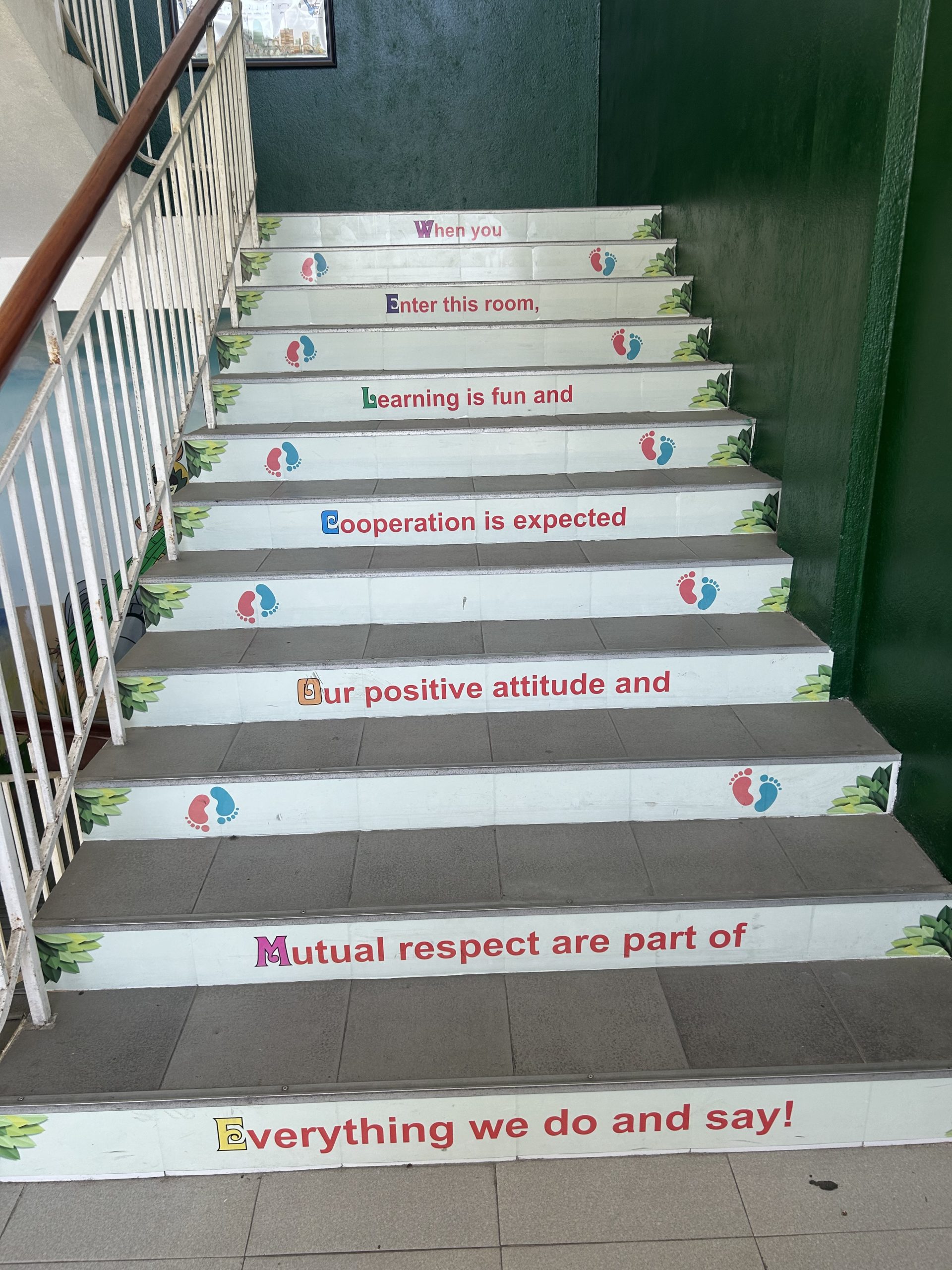 It still amazes me how the teaching style is different from Canada. While preparing for Vietnam I had a rough imagination of how the classroom and teaching would be here. I had completed my middle school in India and the learning style was more standardized. The aspect of memorization was heavily influenced within our learnings. My classroom in India would consist of a blackboard, a projector, individual desks or desks where two students would sit together and fans. Within an English classroom we would be required to read passages and our teachers would provide the answers to the questions where we would then be told to write them down word-for-word and memorize them for the examinations. Having this background influenced my perception on how the school in Vietnam would be like. I thought that Vietnam would be a repetition of what I went through in India, however I was wrong! The way of learning English in Vietnam is more game-based than standardized, making learning more fun for students. The classroom setup is similar to India however in addition to fans, the classrooms have AC! Being hot within a classroom could affect both the teacher and students, so seeing the AC made me really happy! Around the school, there are also stairs that have multiplication and division equations on the steps in addition to motivational phrases. Furthermore, students are so happy to learn English which makes learning and teaching more enjoyable! Before starting my classes I am always swarmed around the most adorable students who do not want to let go! Their faces always light up when seeing us within their school and always rush to say hi or give us a hi-five! When entering the class for the first time, I was given the opportunity to introduce myself and the kids were so happy to see I tried talking in Vietnamese! Although my pronunciation was not great, the students got a grasp of what I was saying in addition to my teacher resaying my sentence properly in Vietnamese! Students were able to ask me a few questions about myself to get to know me and I was so happy to see their smiles and shyness on the first couple of days!